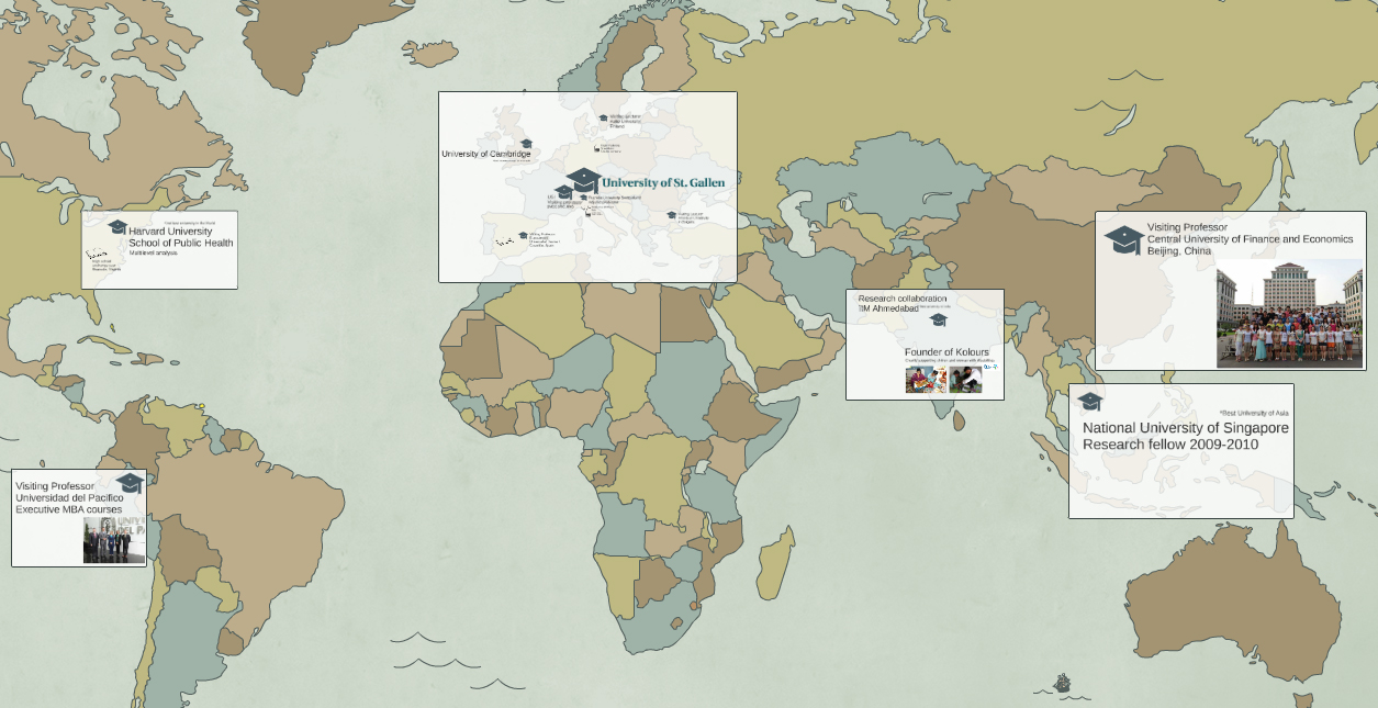 Previously, I been an visiting professor at various universities worldwide including the Universitร della Svizzera italiana (Switzerland), the Central University of Finance and Economics (China), the Universidad del Pacifico (Peru), Aalto University (Finland), Franklin University Switzerland, the American University in Bulgaria, Eurocampus at Universidad Jaume I (Spain) and the University of Freiburg (Germany).I received the Best Paper award from the Frontiers of Business Research in China International Symposium and from the International Conference of Information Visualization, and two personal research grants from the Swiss National Science Foundation.