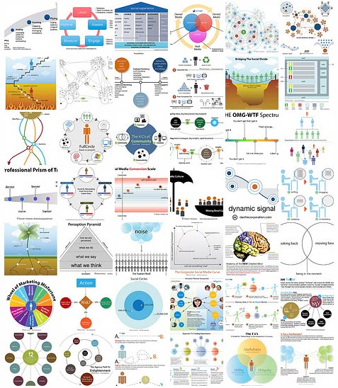 The Logic+ Emotion blog by David Armano is a valuable source of knowledge visualizations applied to the field of digital marketing. This popular and peculiar mix of social media and graphics emerges by the background of the author, vice president of the interactive arm of a global communication agency, who studied graphics and visual communication. He’s written papers, produced slideshows and videos, and has a gallery of knowledge visualizations, called “Visual Thinking archive” with diagrams, flowcharts, visual metaphors and infographics. (Found via Alex Mari)
