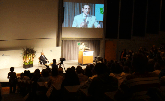 Mario Vargas Llosa, literature nobel prize laureate 2010, gave a public lecture at the University of St. Gallen on Sept 21st, organized by prof. Yvette Sanchez. The Peruvian ambassador (see the picture below) opened the talk with provocative statements, citing the very first lines of the author’s book “Conversation in the Cathedral”, explaining how Vargas Llosa’s writings influenced his perception of Peru and of the need of change for the country. He was followed by a speech of the ambassador of Spain, as “don Mario” is also a Spanish citizen.