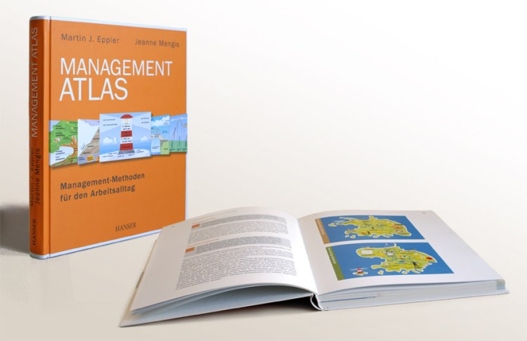 Management Atlas is a new interesting book on knowledge visualization for management by Martin J. Eppler and Jeanne Mengis (in German). The idea of the book is to make management methods, strategies and tools more easily accessible to practitioners by representing them through visual metaphors. The 37 colourful metaphors are grouped together in three continents: methods for the individual, methods for the team, and those for the organization. The authors have chosen often unusual and fun metaphors to think of management problems and approaches: information overload as a dam lake, team development as a rollercoaster, risk management as a black swan, or the polarisation effect in teams as a swing. More information can be found on the book blog or editor