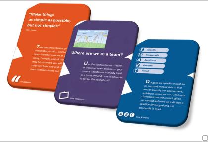 They provide meeting facilitators and participants with ready-to-use cue cards, methods, exercises, inspiring quotes, and key questions to move meetings along productively and share what particpants know, more effectively through simple graphics and instructions.